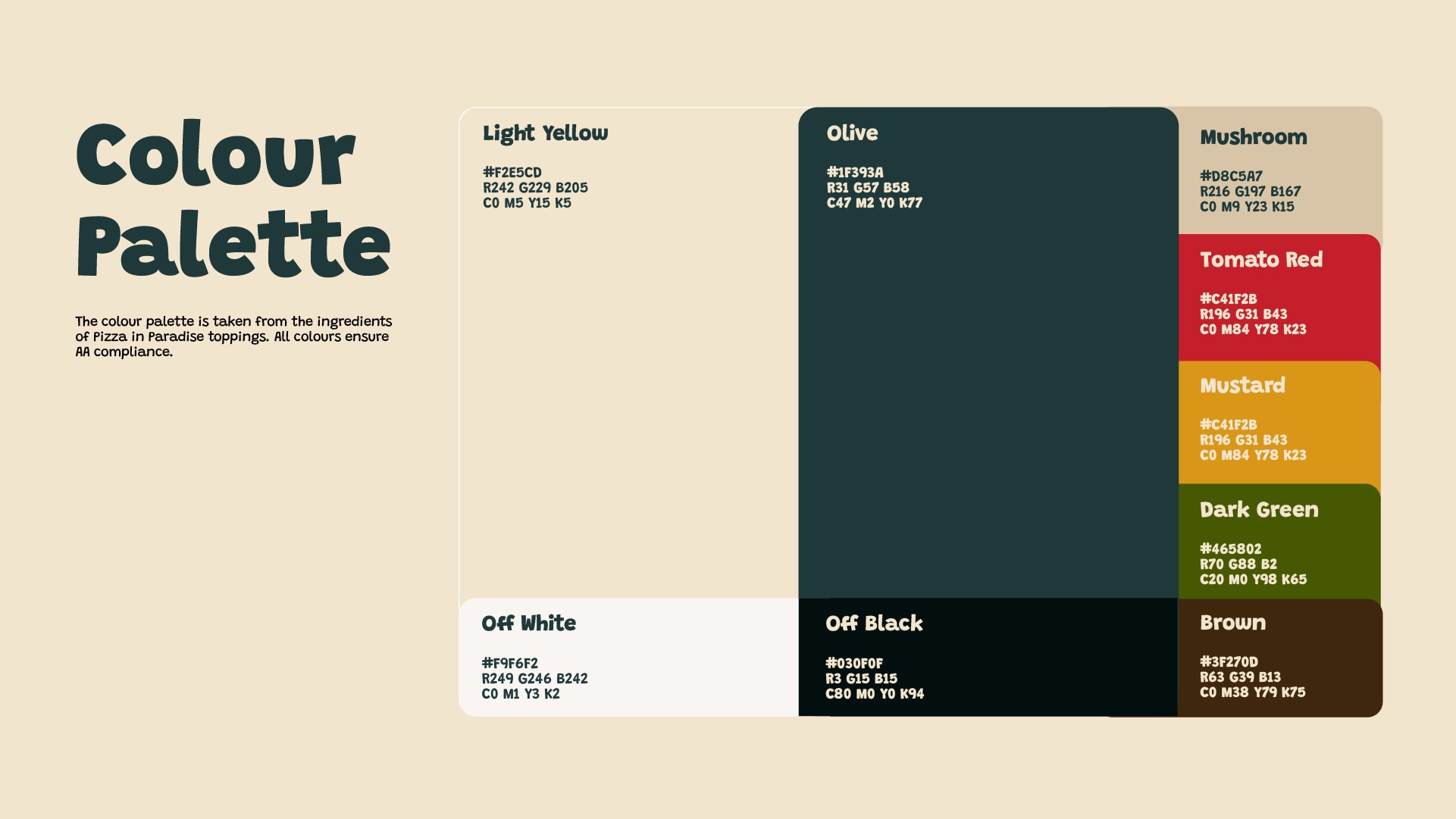Pizza in Paradise is a mobile woodfire pizza pop-up stand that caters to campsites and events. I was commissioned to create a brand and website for the company. The aim was to convey a warm, family-owned ambience into the brand. To ensure a warm and welcoming atmosphere for the brand, I opted for a playful and rounded font. This also translates to the bouncy and playful animation of the logo and icons. The colour scheme was inspired by the client's pizza toppings. The photographs showcase the events that "Pizza in Paradise" caters to, and the entire pizza-making process - right from the dough preparation, and preparation of toppings, to the final product. To ensure easy readability, we've kept the text layout simple and clear, both online and on our menus.